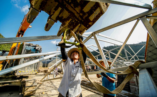 目前,災(zāi)后重建工作正在有序的進(jìn)行,利用起重設(shè)備配合吊裝帶完成倒塌房屋構(gòu)件及物資的吊裝,省時(shí)省力,加快重建速度。