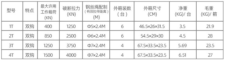 采用高強度鋼板,優(yōu)質碳鋼的一體結構,搭配高密度齒輪,防逆轉設計理念碳鋼套壓制鋼絲繩安全系數(shù)大大提升。